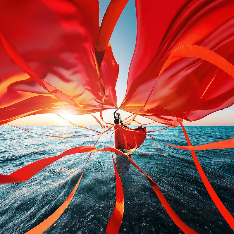 Fear distorts the visual perception and makes you think that the threatening objects are larger and more dangerous than they really are. The picture was taken from one take. Not significant digital processing is present. Снимок сделан с одного дубля. Не существенная цифровая обработка присутствует. Уникальность в том, что девушка сама подбрасывала ткань и успела принять позу, которую мы обсуждали предварительно.