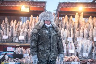 Hello from the Pole of cold -48....У нас с другом Сергеем Шариным есть проект «Глазами якутянина», где мы из под копюшена с мехом и закрытой варежкой у рта (согревающей лицо) снимаем обычные для якутян места....И приглашаем вас на наш вполне привычный якутский Крестьянский рынок, который сейчас Нового года особенно популярен, так как ни один праздник в Якутии не обходиться без Строганины (сырой замороженной настроганной рыбы с солью и перцем) и Салата «Индигирка» (замороженная рыба режется кубиками, добавляется лук, растительное масло и перец).....А вот теперь представьте: за окном -48 градусов, прямо на улице такая рыбка (а еще свежеезамороженное мясо, ягоды, замороженное молоко продаются на прилавках)...самая вкусная наша речная рыба - Чир, нельма, муксун, таймень, караси, щука и многое другое стоят стройными рядками прямо на хвостиках как статуэтки